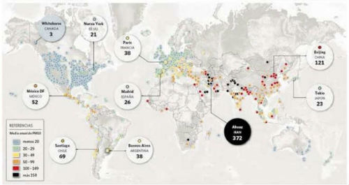 La ciudad industrial y petrolera de Ahvaz, al suroeste de Irán, fue la ciudad que alcanzó los niveles más altos de partículas suspendidas menores de 10 micras, al tener 372 microgramos por metro cuadrado (µg/m3) de promedio anual. La exposición a este tipo de partículas, también conocidas como PM10, provoca daños a muchos sistemas orgánicos del cuerpo humano; el nivel máximo recomendado por la OMS en este tipo de partículas es de 20 µg/m3. La capital de Mongolia, Ulan Bator, obtuvo un promedio anual de partículas PM10 de 279 microgramos por metro cuadrado. La siguiente ciudad en la lista fue Sanandaj, también en Irán, que alcanzó los 254 µg/m3. Según la OMS, existen diversas causas por las que los niveles de contaminación se disparan, sin embargo, indicó, frecuentemente esto se debe a la rápida industrialización, las industrias pesadas y el uso de combustibles de baja calidad.